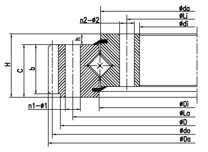 | INA 型號(hào) | LYC 型號(hào) | TG 型號(hào) | 外形尺寸(mm) | 安裝尺寸(mm) | 結(jié)構(gòu)尺寸(mm) | 齒參數(shù)(mm) | 額定軸向靜負(fù)荷(KN) | 重量(KG) | | Da | D | di | H | La | Li | n1 | n2 | φ1 | φ2 | D1 | d | b | h | B | C | Di | da | m | z | do | x | 動(dòng) |