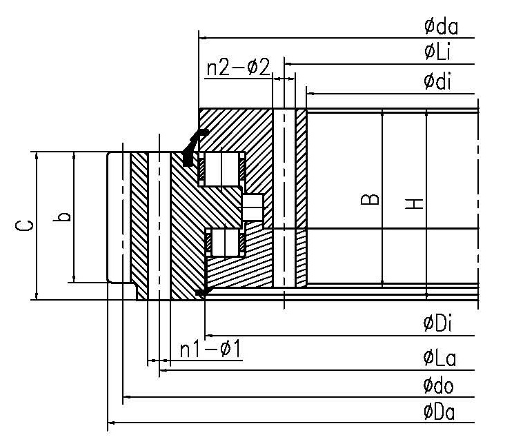 | INA 型號(hào) | LYC 型號(hào) | TG 型號(hào) | 外形尺寸(mm) | 安裝尺寸(mm) | 結(jié)構(gòu)尺寸(mm) | 齒參數(shù)(mm) | 額定軸向靜負(fù)荷(KN) | 重量(KG) | | Da | D | di | H | La | Li | n1 | n2 | φ1 | φ2 | D1 | d | b | h | B | C | Di | da | m | z | do | x |