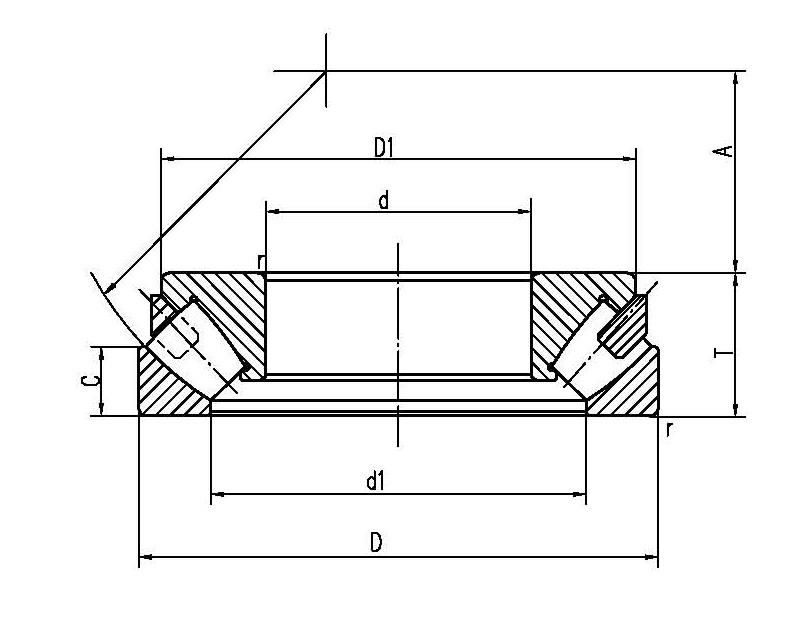 | 外形尺寸(mm) | 基本負荷(KN) | 極限轉速(r/min) | 重量(KG) | | d | d1min | D | D1max | T | B | C | A | rsmin | 動 | 靜 | Old_spec | Designations |